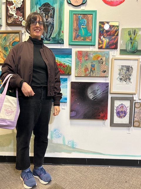 Here I am at Kaleid Gallery, standing next to one of my pieces from the exhibition on view through January 17, 2026. Raised in New York and New Jersey, my creative path began early, studying art with Evelyn Leavins in Red Bank for eight years before attending the School of Visual Arts in New York City. Today I call the Bay Area home, where my practice spans mixed media collage, painting, screen-printing, graphic design, music, animation and video. My work is influenced by nostalgia, the past, spirituality and the unseen threads that connect everything. I love weaving vintage materials—old magazines, found images, forgotten paper—from the early ’70s and earlier into layered compositions that honor the past while creating something entirely new.